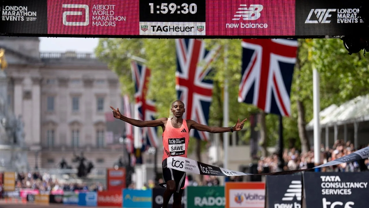 The fastest human being on the planet over the marathon and the first person to officially break 2 hours. Someone call Kipchoge and tell him there’s a new kid on the block, taking the ribbon in front of the Buckingham Palace, respect the reign when he knights himself a new King of the Marathon. 1:59:30 on the clock, the holy grail of 2:00:00 has finally been broken and the unthinkable has been achieved. Slapped on the burners in the second half, this gunman took over the frontlines and left the trenches in a flashbang. Arms out wide destroying the WR, Sawe calling out Emeli Sande to write some more bars because he making the masses put it in all of the papers and make everyone read all about it. They said 2 hours will never be broken but big Sab told em to hold his beer and tell' em whats’s up. Sawe, it’s time you’re given the keys, we’re witnessing the aura reach new heights every race this is heritage in London, history has been made and we’re witnessing what greatness looks like in the flesh.